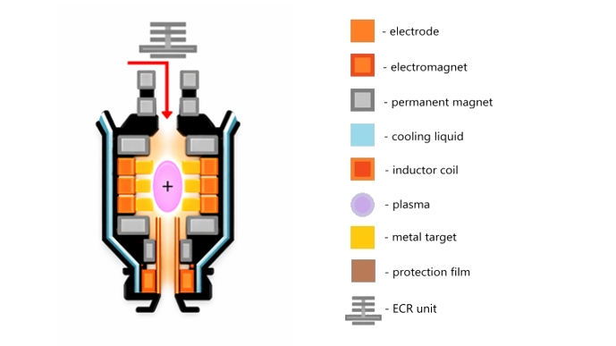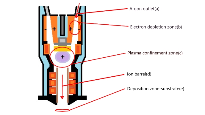 The ionization process start at the electrode level, argon flooding the hollow cathode ionization begins. plasma, having high energy density and low mass enables fast superficial sputtering/evaporation of surface atoms, induction heating counting for about 80% of the metal's current melting temperature, the rest being takwen care of by the plasma inflow. Hollow cathode design have the downside of faster degradation and surface corrosion, being limited in vacuum systems. Even so, ECR ionization often represents a more efficient method in vacuum systems compared to normal hopllow cathode designs. Protective film will be places inside the nozzle cavity (ion barrel-d), which has the purpose of protecting structural parts from off-axis chaotic metal ions which could accidentally plate unwanted areas. Even though meagnetic confinement limits this phenomena, collisional diffusion as well as ambipolar diffusion perpendicular to the field lines still could count for slow deposits to accumulate on the barrel.